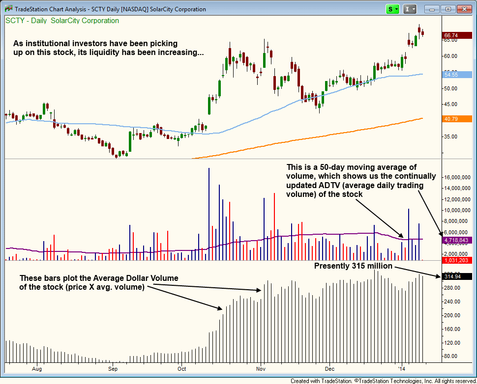 The top section of this chart shows the price action (and a few moving averages), the middle shows daily volume bars and 50-day ADTV, and the bottom bars plot the Average Dollar Volume (in millions).