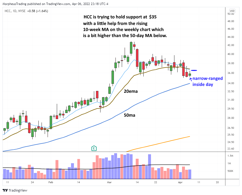 $HCC is not an official setup but is worth watching for an entry over the high of Wednesday’s tight-ranged inside day. Note that the price is pulling back into the 10-week MA on the weekly chart.