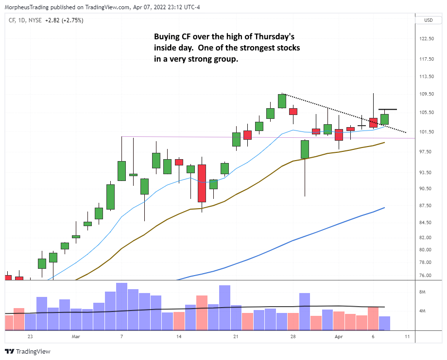 $CF is one of the strongest stocks in the market and part of a top 10 industry group. Thursday’s inside day creates an entry over the high of the day.