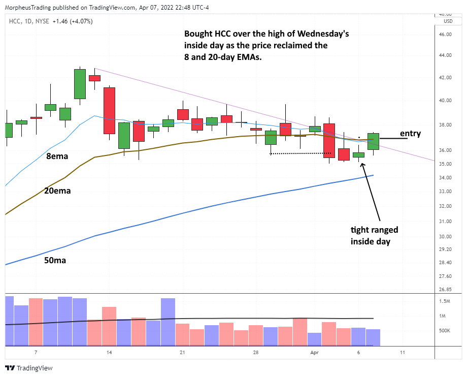 $HCC is a coal stock that just recovered from an undercut of 20-day EMA. We entered over the 8-day and 20-day EMAs, after the price pushed through the high of Wednesday’s tight-ranged inside day. Other coal stocks are also looking pretty good ($AMR $ARCH $BTU).