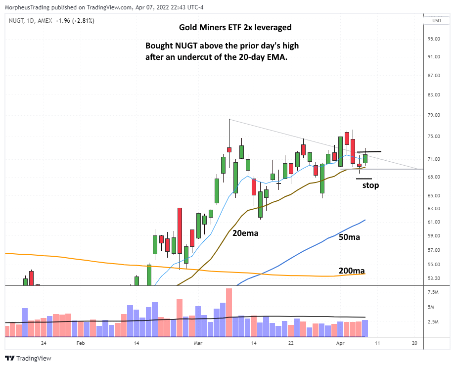 $NUGT is a 2x leveraged gold miners ETF that is forming a volatility contraction pattern with the price swings tightening up from left to right. We bought the move above the prior day’s high which was an undercut of the 20-day EMA.