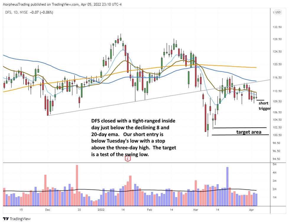 $DFS is forming a ledge, which is what we call basing action in a downtrend when the moving averages are stacked to the downside (20<50<200). The highs of the ledge stalled just below the declining 50-day MA and is now in chop mode setting lowers highs. Our entry is beneath the low of Tuesday’s tight-ranged inside day, with a protective stop above the three-day high.