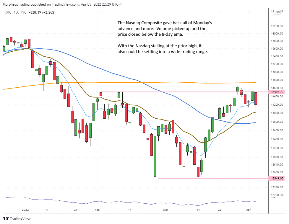 The S&P 500 and Nasdaq Composite sold off on higher volume and erased all on Monday’s advance and a bit more. The selling increases the odds of further chop and a possible test off the rising 20-day ema in both indexes (and 200-day MA in S&P).