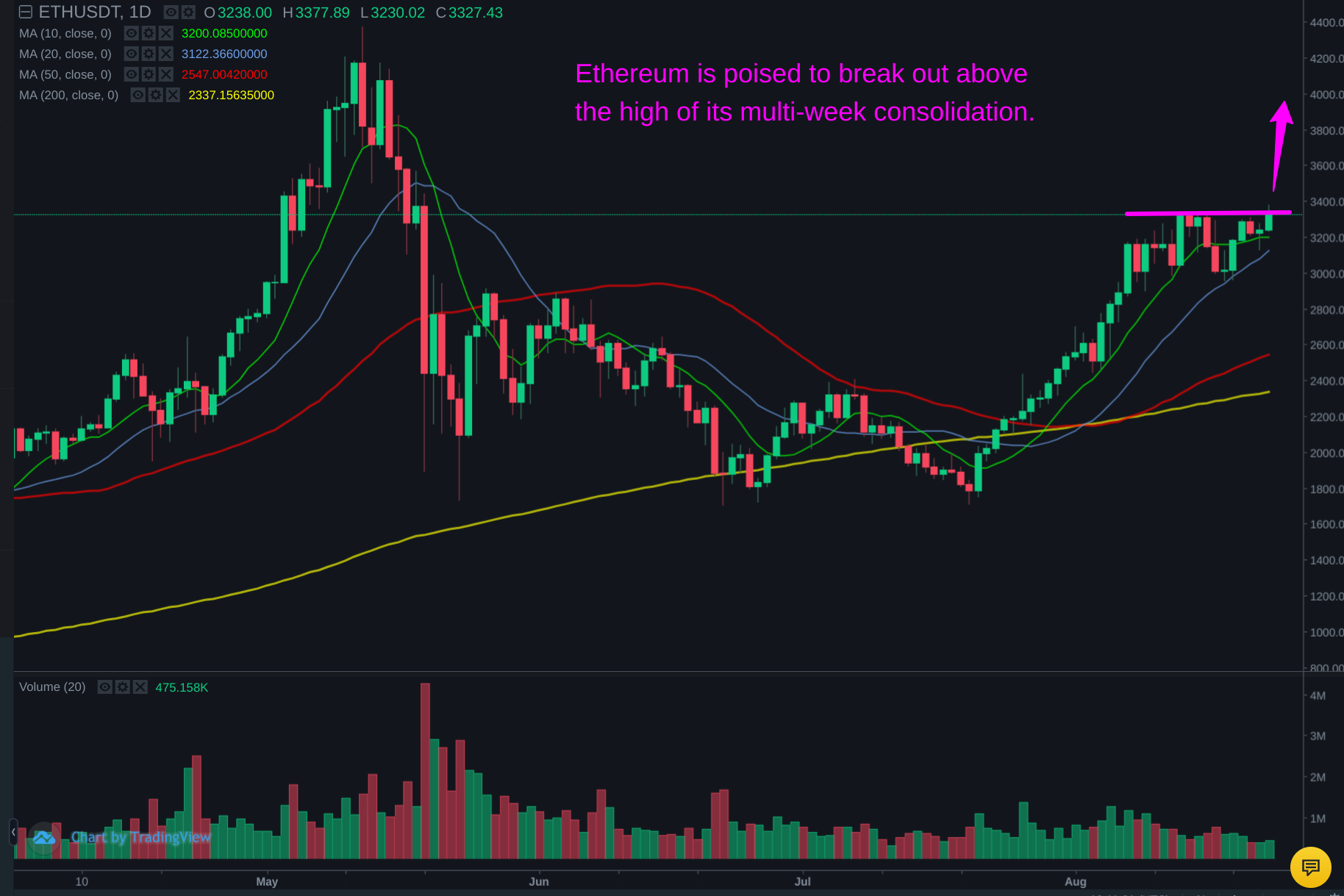 On the daily chart below, notice that $ETH is now poised for a breakout above the high of its 2-week consolidation and resumption of its uptrend: