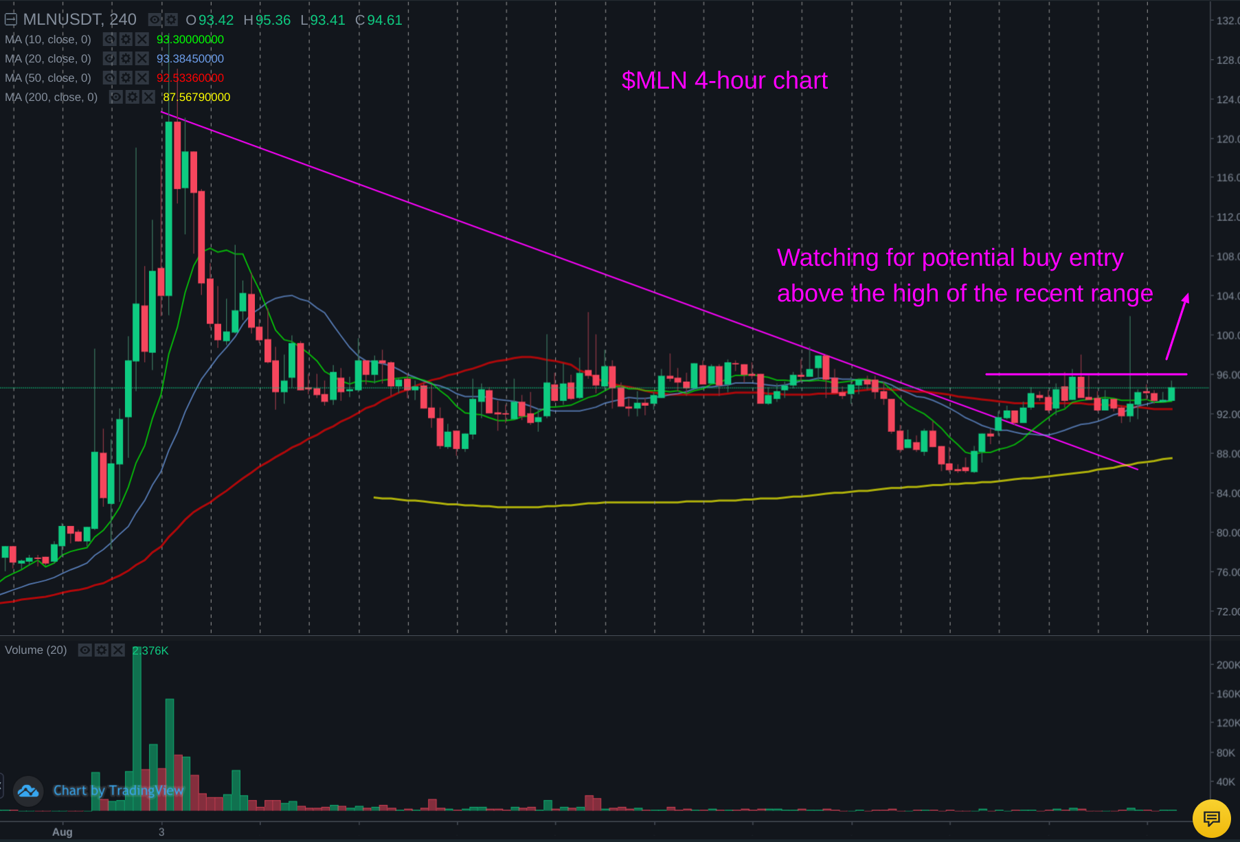 Enyzme Finance ($MLN) has been forming a long consolidation pattern after pulling back from the highs of a big rally a few weeks ago.