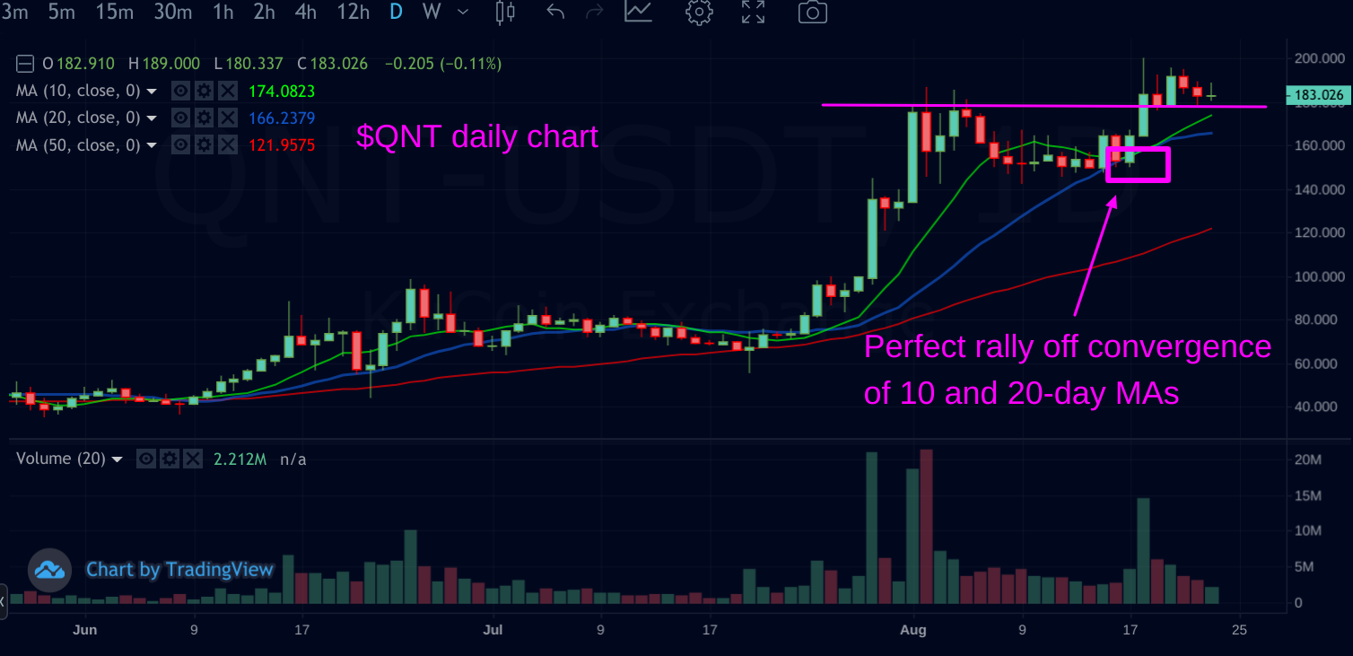 $QNT recently rallied to new all-time highs after the 10 and 20-day moving averages converged to provide support on August 17.