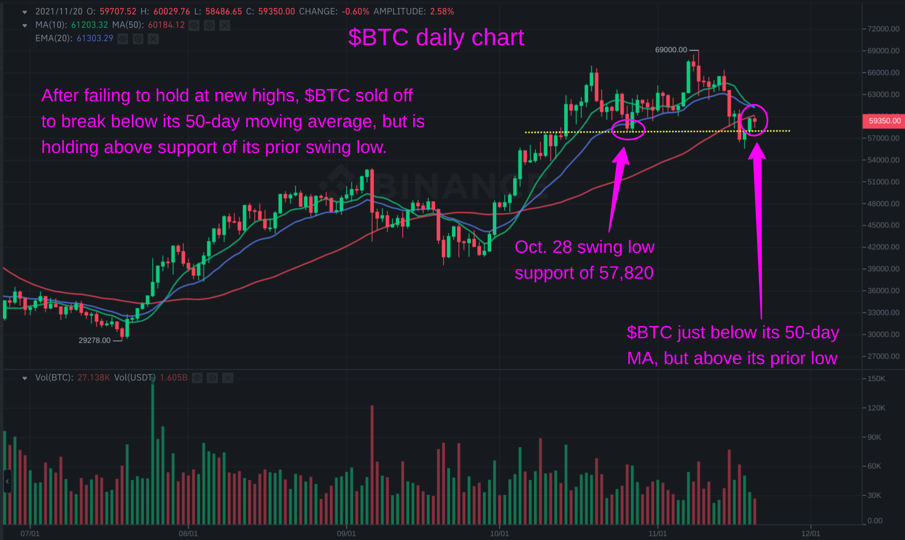 $BTC undercut key, intermediate term support of its 50-day moving average, but quickly stabilized above support of its prior swing low from October 28 (just below 58,000):