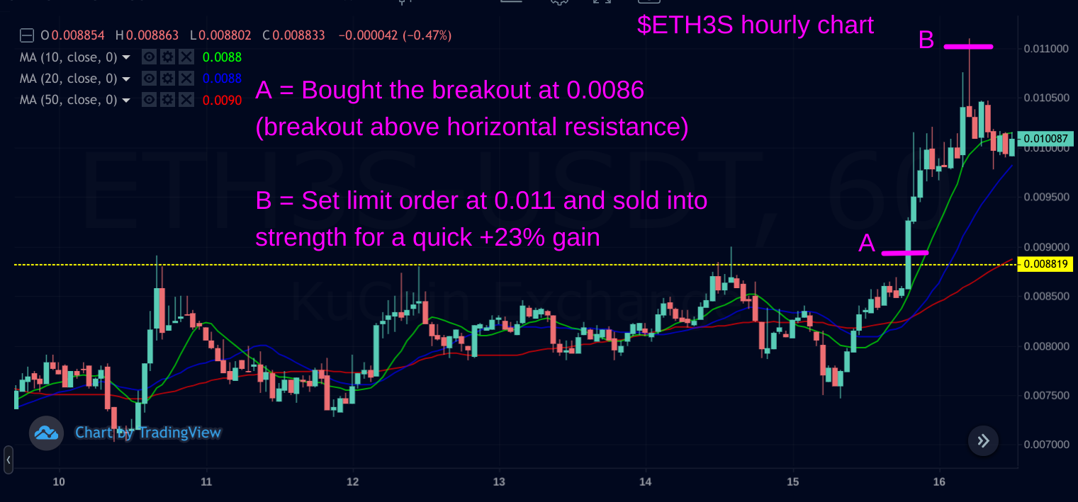 Our entry and exit points on $ETH3S are shown below (the underlying $ETH asset correspondingly moved in the opposite direction):