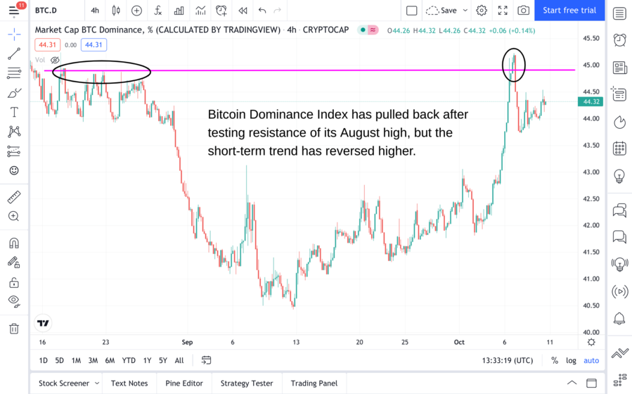 Drilling down to the 4-hour chart, it becomes apparent the short-term trend of $BTC.D has reversed higher: