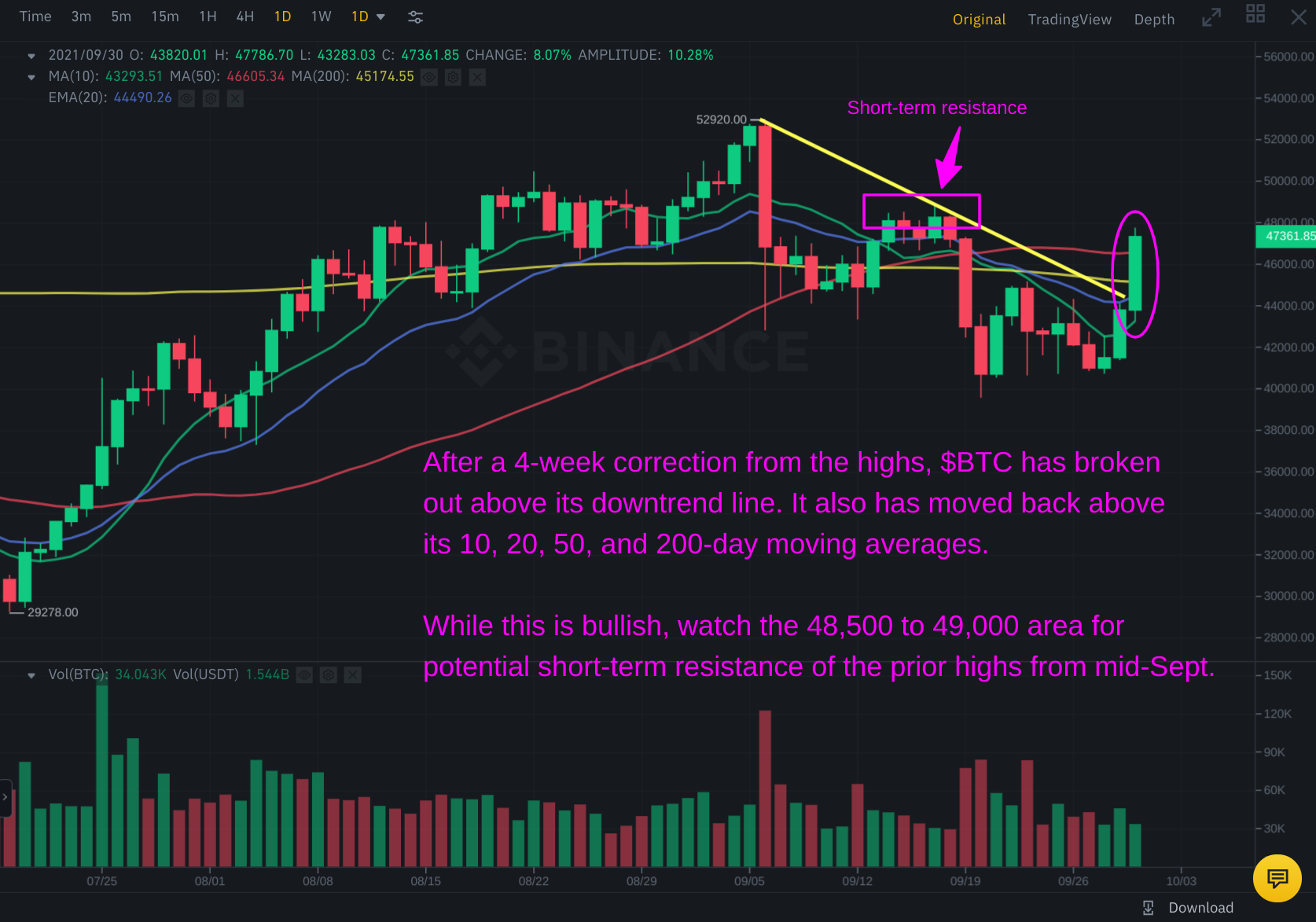 Most notably, Bitcoin’s rally today (October 1) enabled the $BTC to break out above pivotal resistance of its downtrend line from the September 6 high.