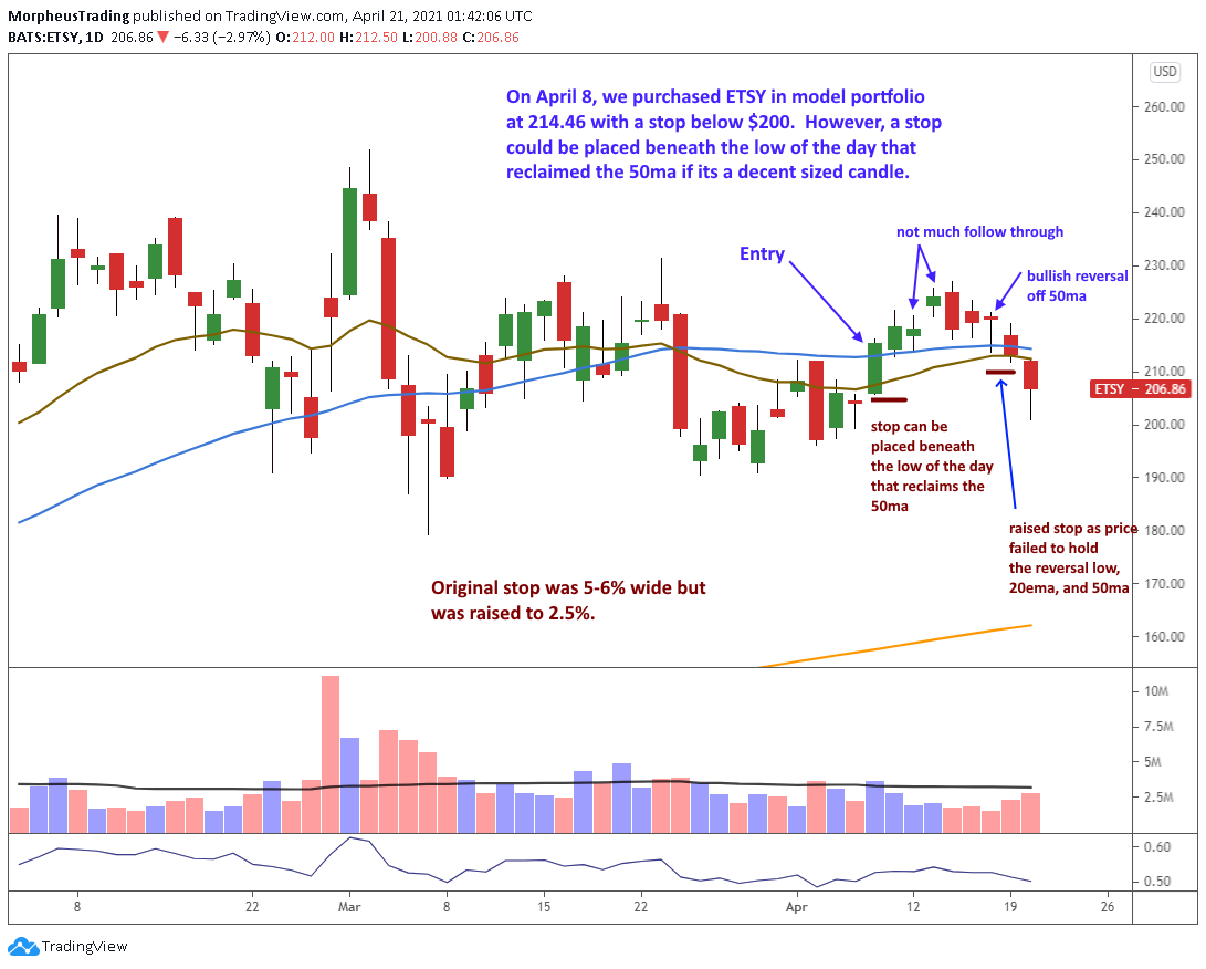 The $ETSY chart below shows how we initially placed our stop below the 50-day MA, then moved it higher when the rally attempt started to falter:
