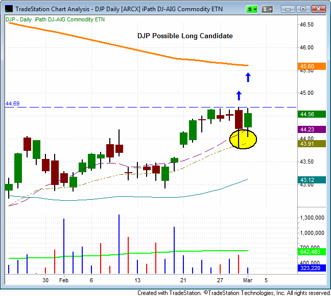 Over the past two sessions, the iPath Dow Jones AIG Commodity ETN (DJP) has formed back to back reversal candles, as it has tested support of its 10-day and 20-day moving averages. A move above the two day high of $44.69 could present a buying opportunity in this ETF. We are placing DJP on the watchlist. Trade details can be found in the watchlist portion of the newsletter.