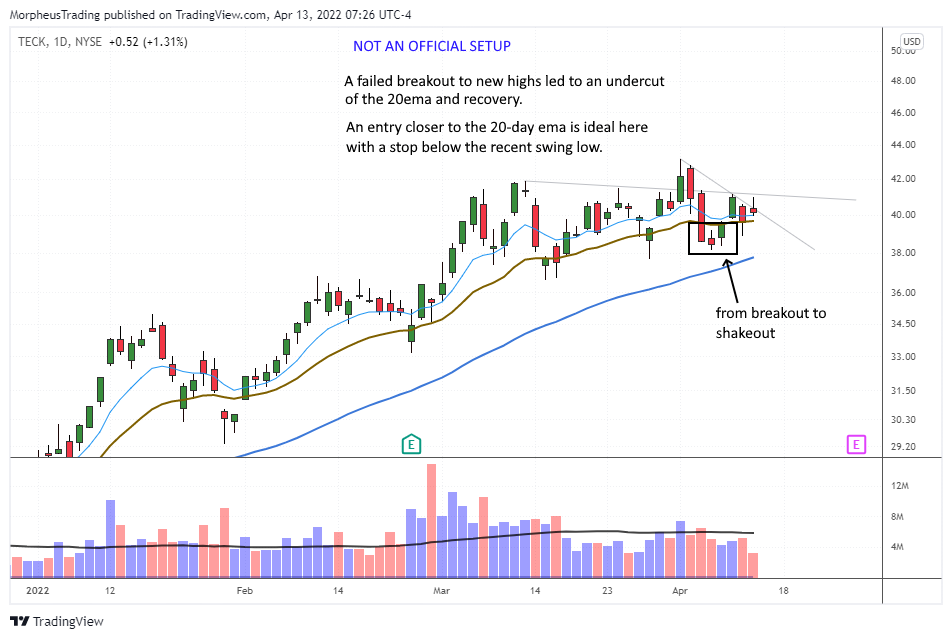$TECK is a coal, copper, zinc, and gold miner that is trading near highs with a 97 RS rating from IBD. A recent false breakout led to a shakeout below the 20-day EMA and recovery back above. Commodity-based trades should be entered on weakness which makes $TECK in play near the 20-day EMA with a stop below the swing low. This is not an official setup as we already have a few open positions in coal and gold miners.
