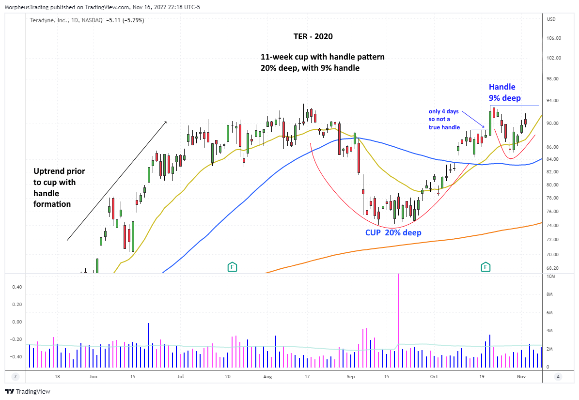 Of course, keep in mind that the cup and handle pattern can fail, so always use stops. Don’t risk more than 7% to 10% below your entry price—even less with an early entry point.