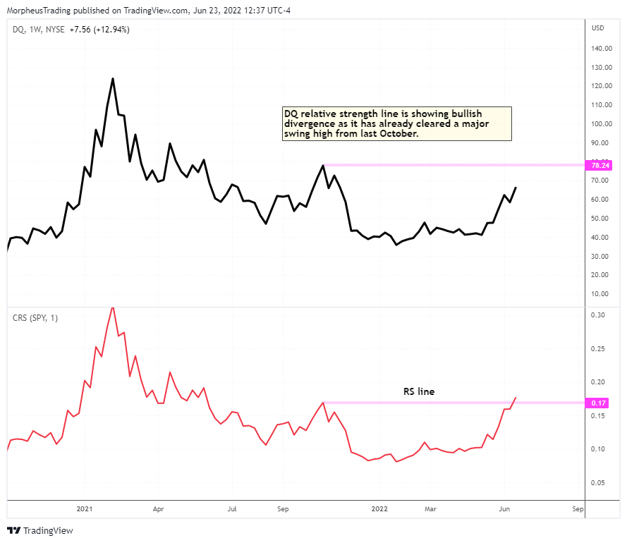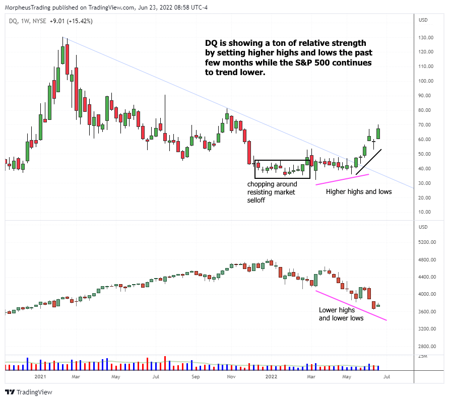 Above, notice how $DQ chopped around during the first quarter of 2022, while the S&P 500 was setting lower lows.