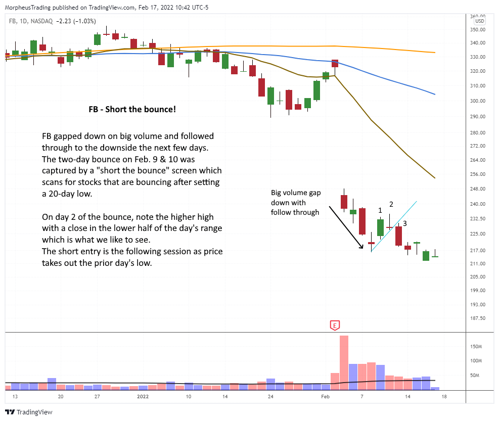 Our recent short setup in $FB was a simple trade setup that looks for weak, downtrending stocks that can only manage to bounce for 2 to 3 days before resuming their downtrends.
