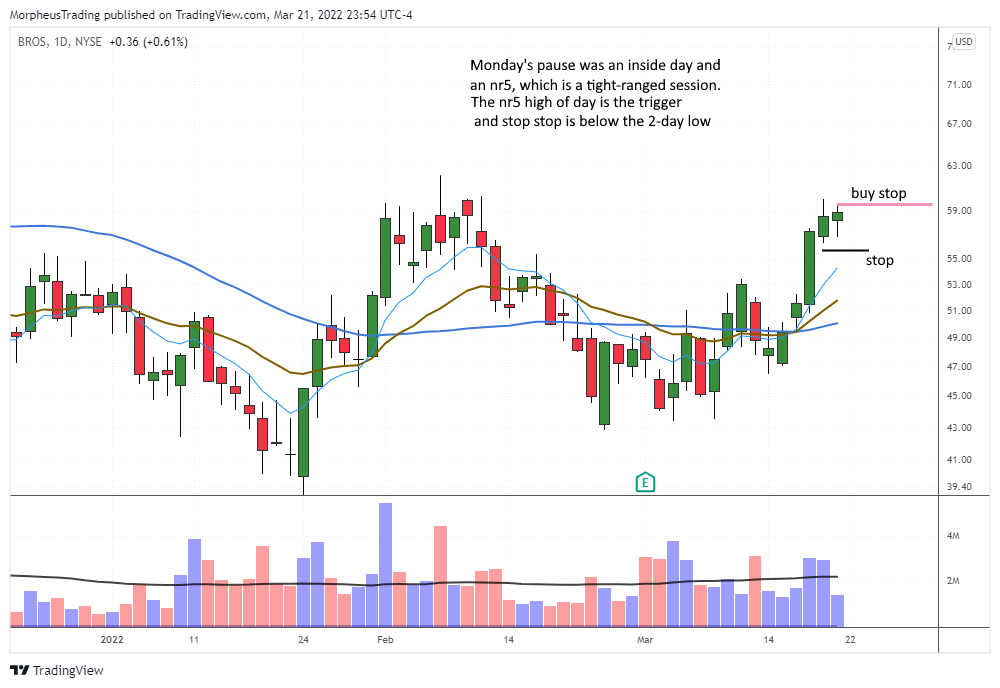 $BROS is another IPO with a strong move up after reclaiming the 50-day MA. Monday’s session is an nr5 day, which is the most narrow trading range of the last five sessions.