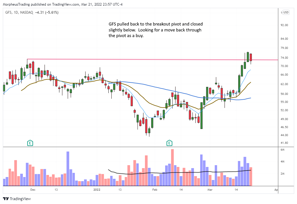 $GFS is a recent semiconductor IPO with a ton of relative strength and a breakout to new highs last week. Monday’s selling closed back below the breakout pivot, but not by much.