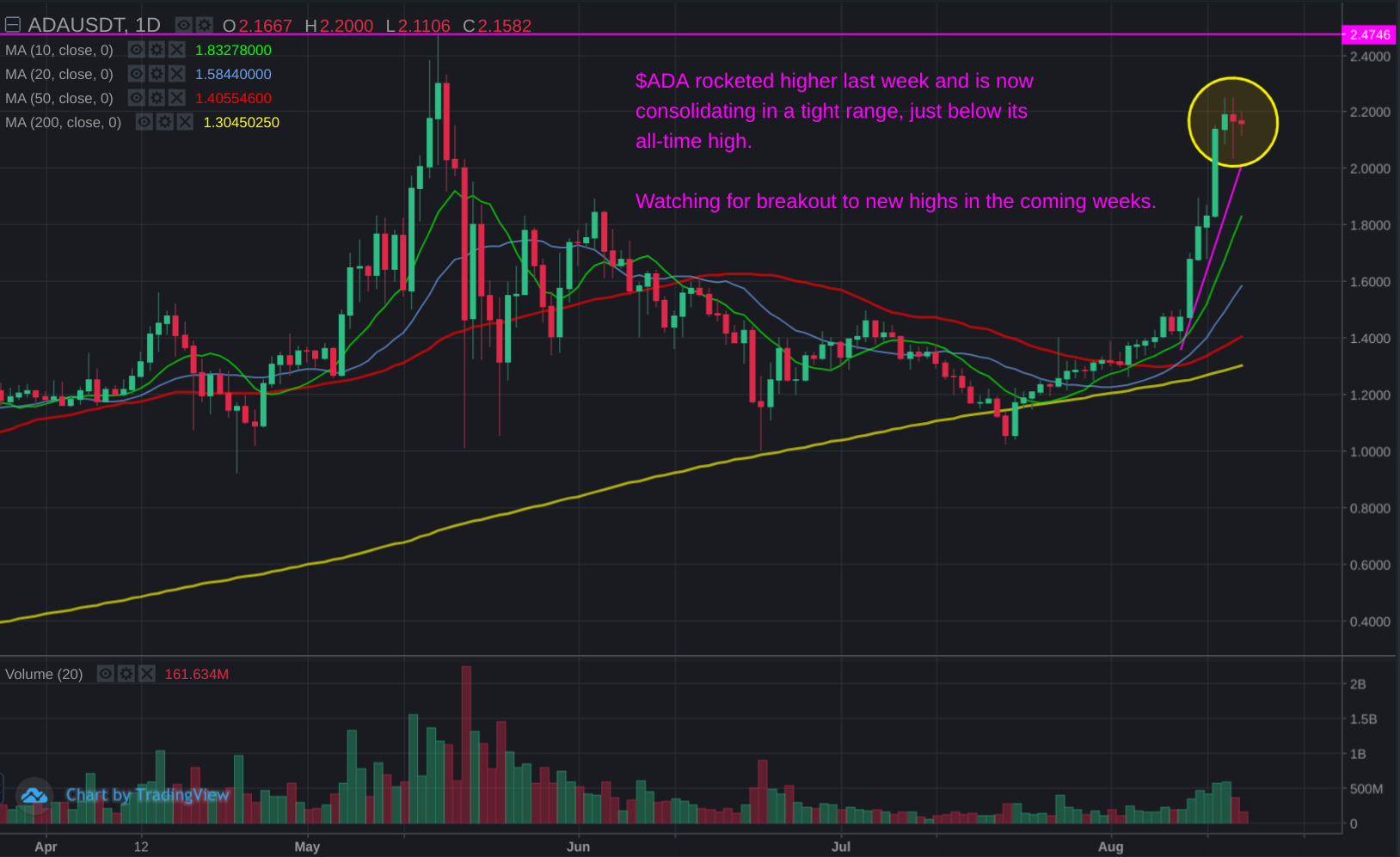 Cardano ($ADA), currently the fourth largest cryptocurrency by market cap, blasted higher last week and is now within striking distance of new highs.