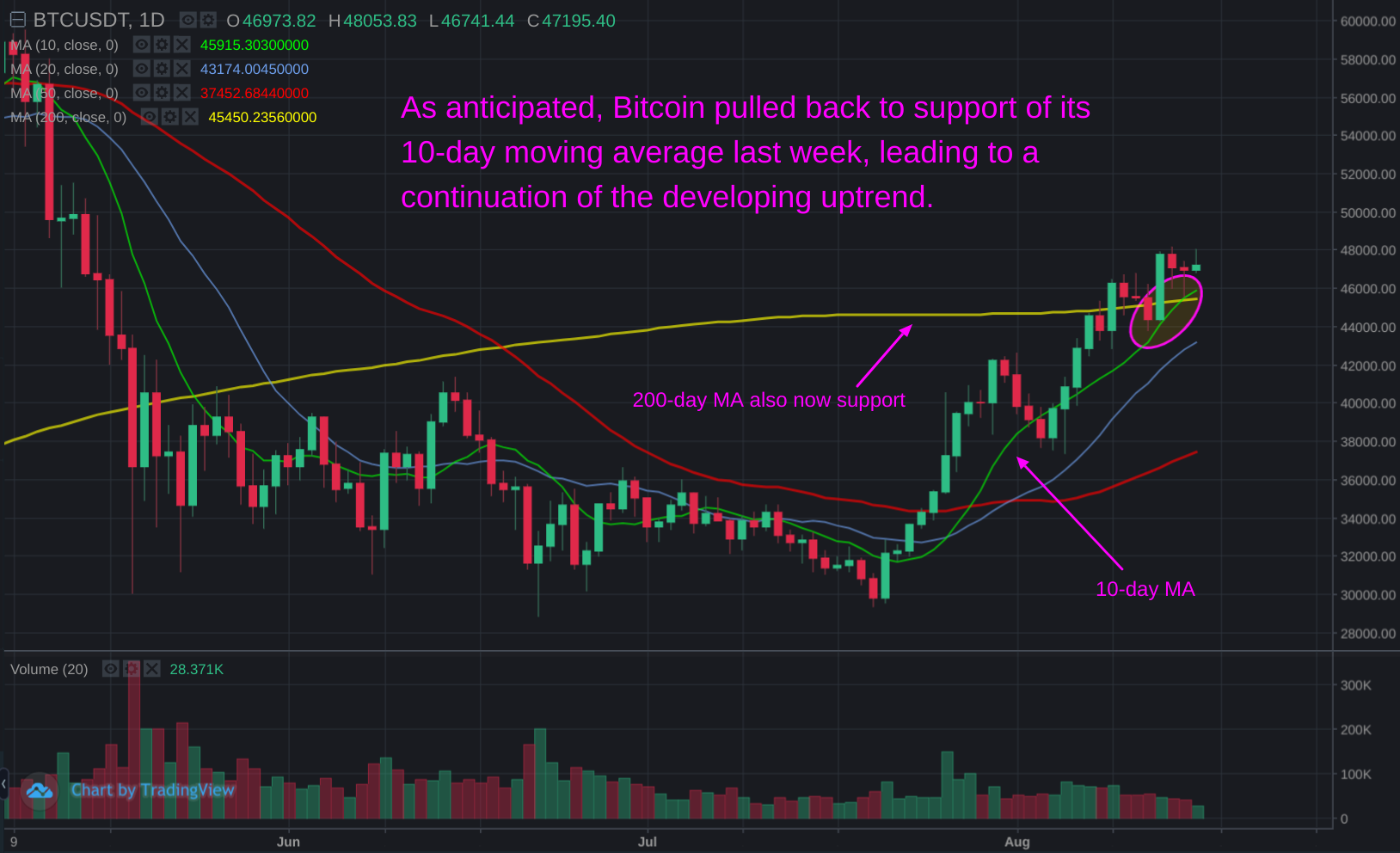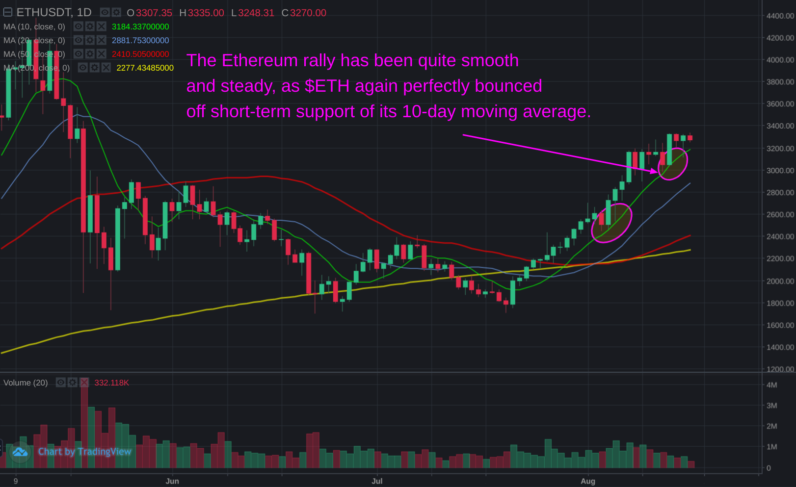 On August 13, we alerted members of Morpheus Crypto Chat that both Bitcoin and Ethereum were pulling back to support of their 10-day moving averages.