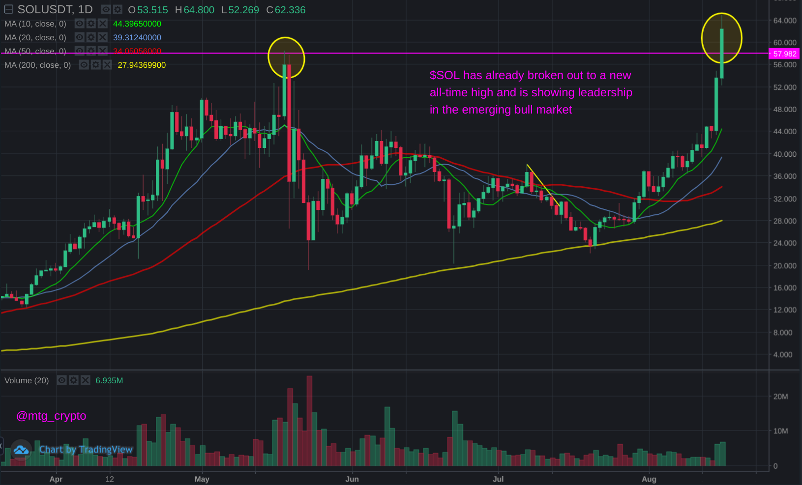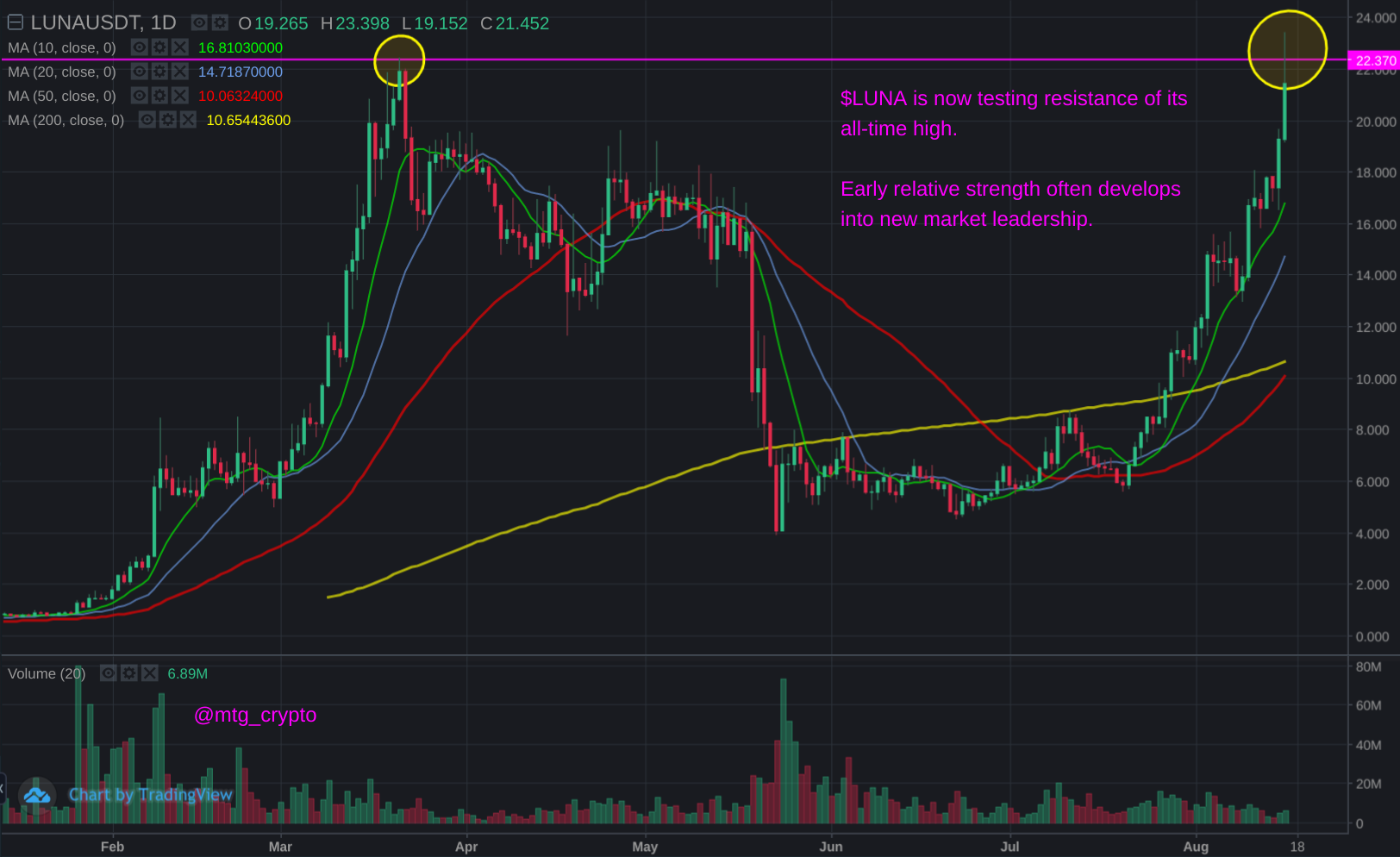 Like $SOL, Terra ($LUNA) has been showing impressive relative strength and is now testing resistance of its all-time high: