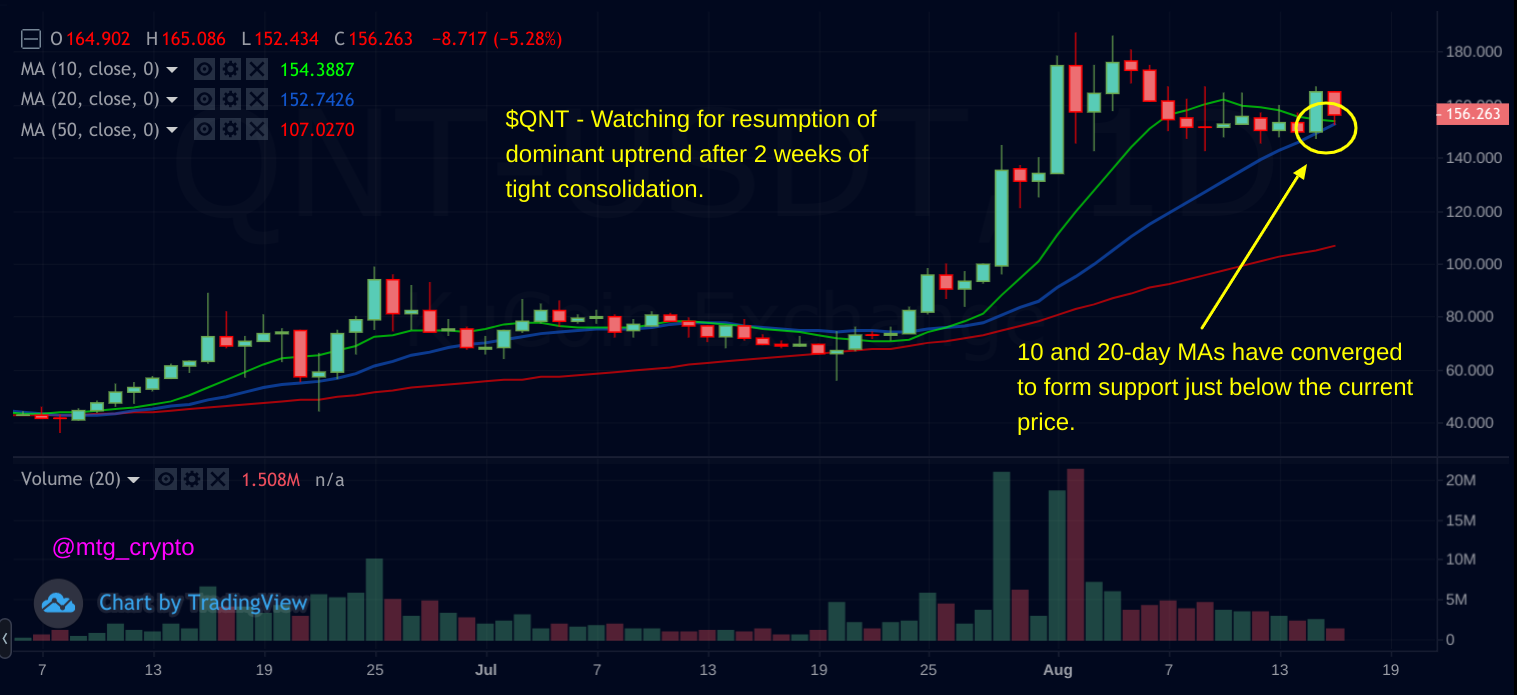 With the 10 and 20-day moving averages now converging to provide support, be on the lookout for a potential move in $QNT soon;and may soon: