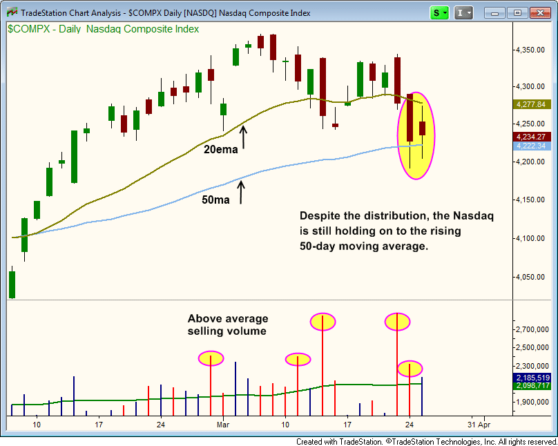 On both March 24 and 25 (circled in pink), the NASDAQ “undercut” support of its 50-day moving average on an intraday basis, but still managed to close each trading session above it.