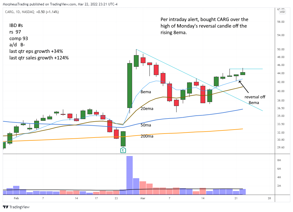 Three new positions were added to the model portfolio on Tuesday. $BROS and $GFS triggered off the official watchlist. Per intraday alert, bought $CARG over the high of the prior day’s reversal candle.