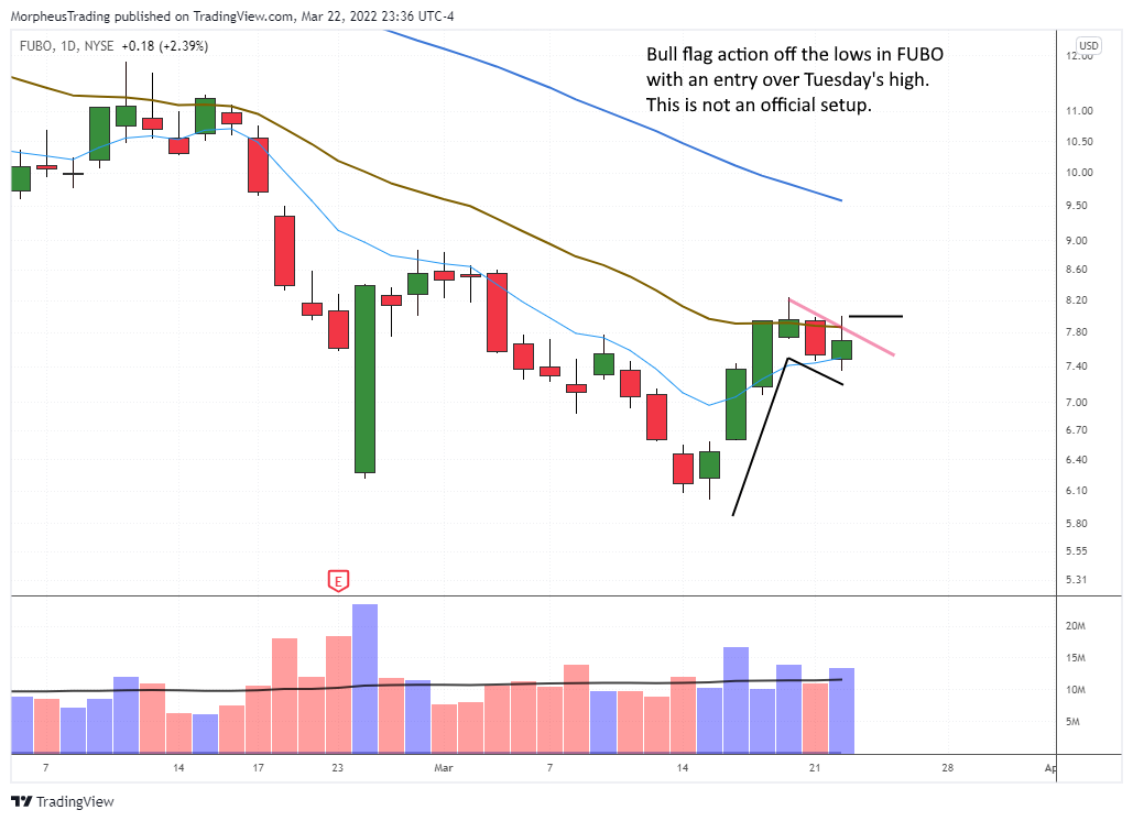 We did find a few bull flag-like setups in stocks bouncing from 52-week lows. These setups should be treated as quick swing trades since they are counter-trend.